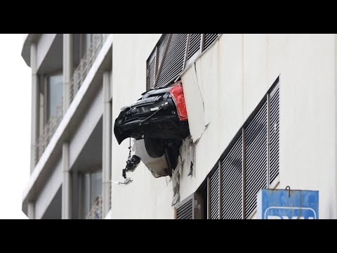立体駐車場の壁を自動車が突き破る